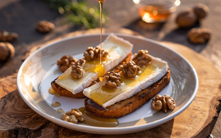 Crostini med Roccaverano DOP-ost, honung och rostade valnötter
